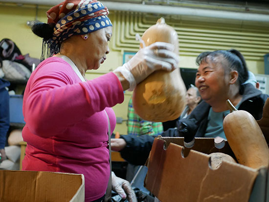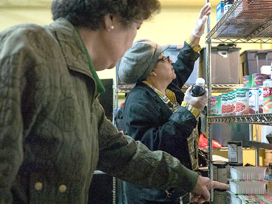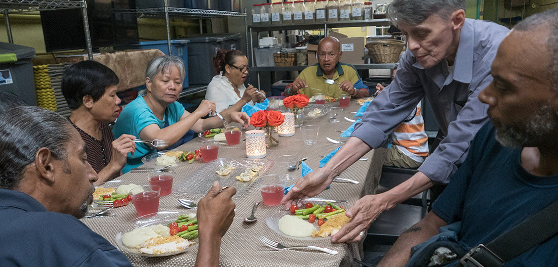 Rev. Pat serving baked dreaded fish and vegetablesThe serving team of Rev. Pat Bumgardner, Ernesto Declet-Ross, and John Phelps has it down to a science. After Rev. Pat's opening with a prayer,the machine team pulls out all the stops in serving people their drinks and meals with kindness (combined with efficiency!) and genuine care. Appetizers have ranged from tuna sald with dill weed on flax crackers to prosciutto-wrapped watermelon to grapes and cheese; entrees from baked salmon over asparagus to parmesan-crusted chicken to turkey meatloaf to spaghetti and meatballs. And of course, there is always a great dessert. If ever in the area on Community Dinner day, consider partaking in the meal, either as a guest or as part of the serving team! All are welcome and all walk away with the memory of a tasteful and satisfying communal experience.
