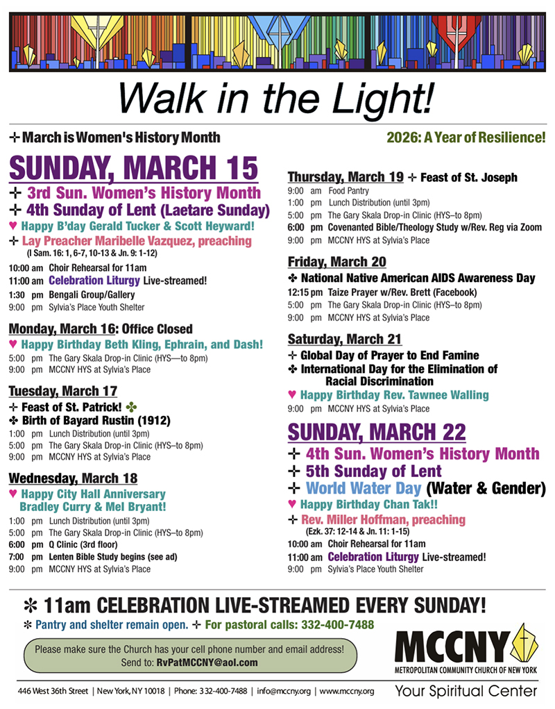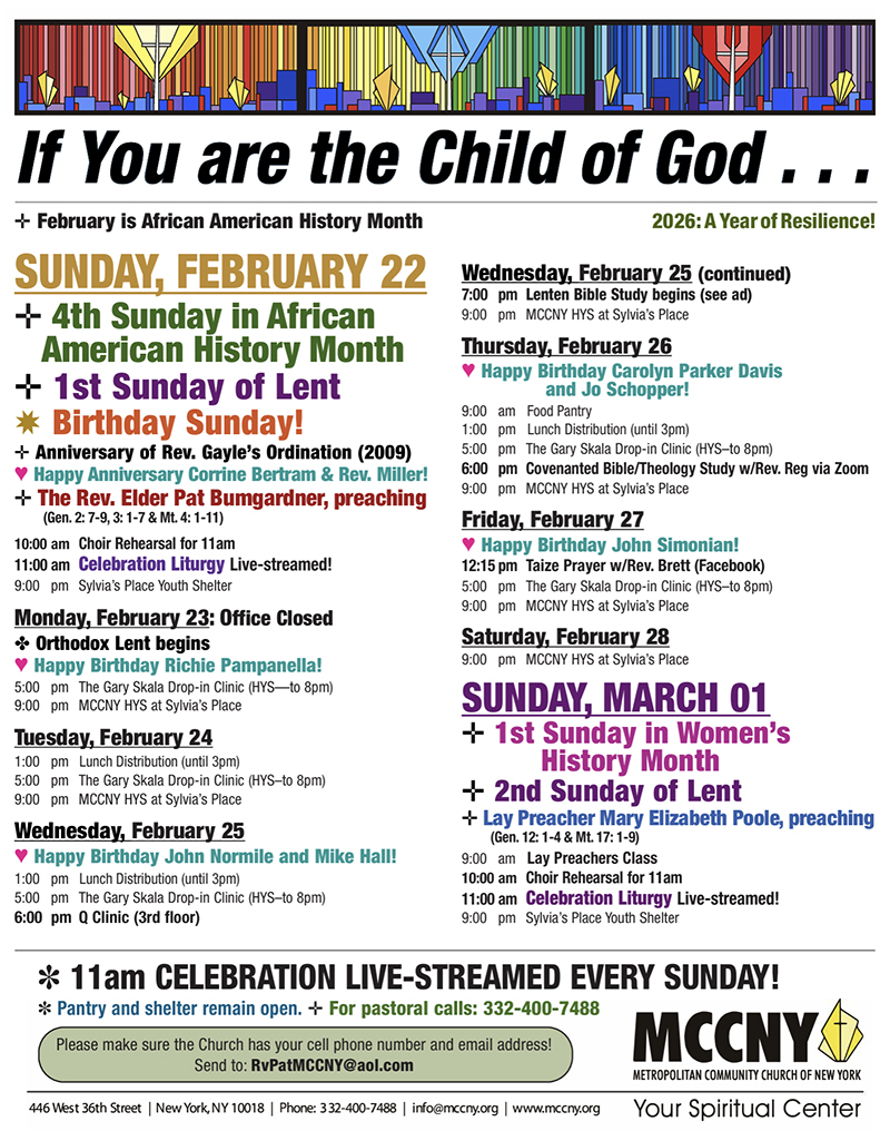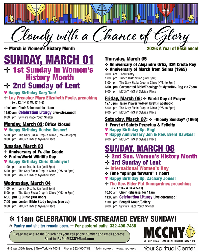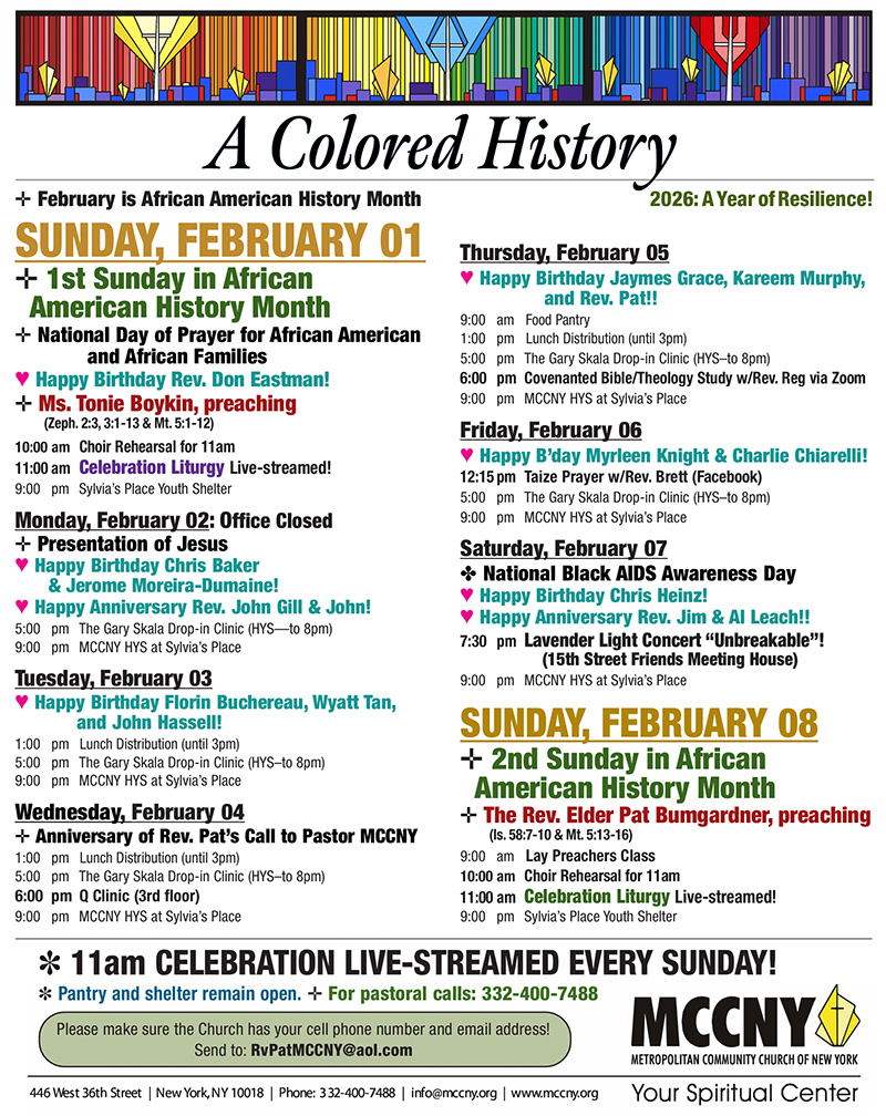 MCCNY is located in Manhattan at 446 W. 36th St. beteewn 9th and 10th avenues, just a few blocks from Pennsylvania Station and the Port Authority Bus Terminal.